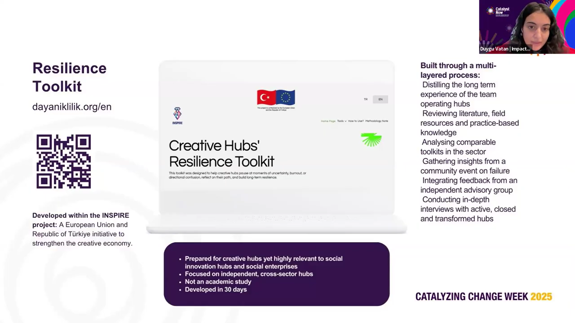 This insight emerged from Impact Hub Ankara’s research on organizational resilience, conducted within a European Union–funded project. The toolkit was shaped through field interviews with active, transformed and closed hubs, as well as collective failure-focused gatherings. The study examined how independent social innovation organizations sustain purpose, creativity, and collective well-being in volatile environments, and the findings were synthesized into the Resilience Toolkit — a practical framework designed to help organizations assess and strengthen their own resilience capacities. Through Impact Hub Ankara’s Resilience Toolkit, eight pillars are identified that sustain organizations during uncertainty: purpose alignment, financial health, partnerships, system awareness, team well-being, adaptive governance, and self-defined success measures, among others. |
