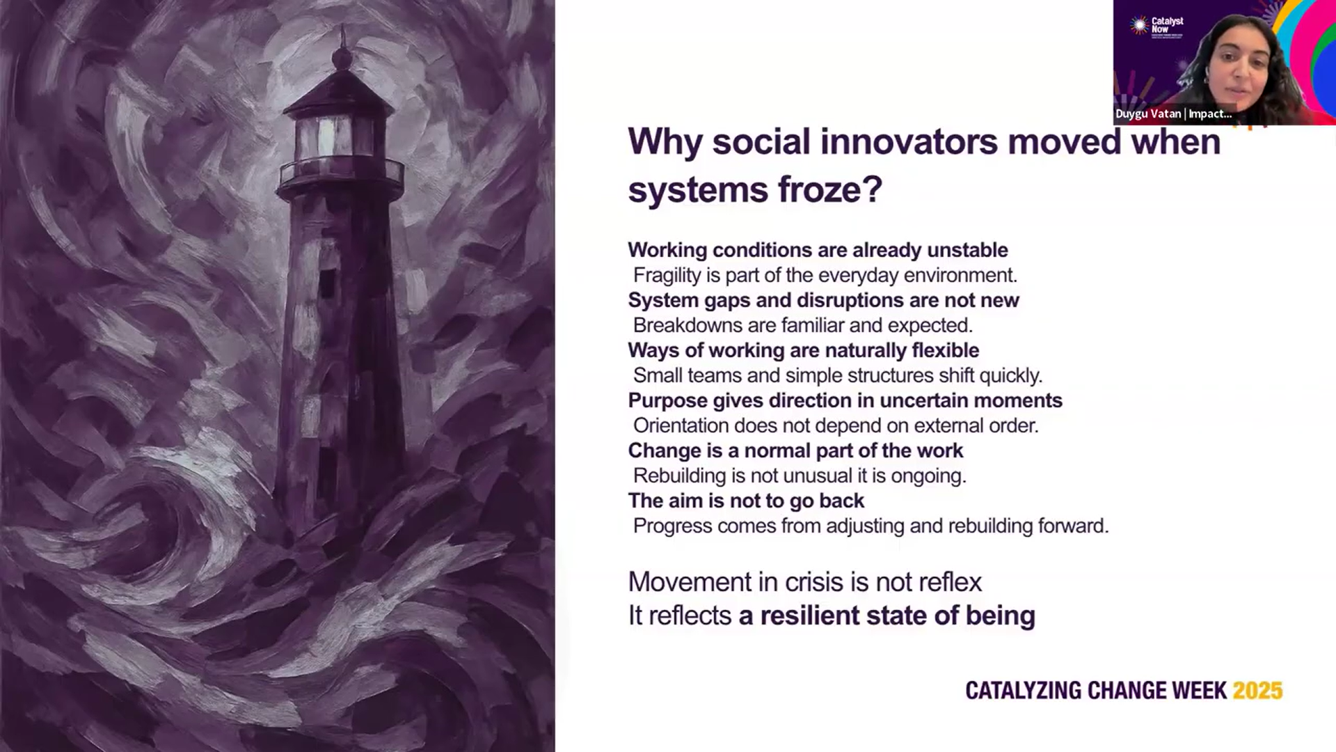 In February 2023, Türkiye was struck by two devastating earthquakes that affected 11 provinces and millions of lives. Crises can disrupt communities, but they can also catalyze transformation. For the various actors working towards social good in Türkiye, renewal is not about returning to what was lost, it is about rebuilding with deeper purpose, stronger solidarity, and a clearer sense of justice. This was the guiding spirit of the session “From Crisis to Renewal: The Role of Social Innovators” at Catalysing Change Week 2025. The discussion brought together various voices from Türkiye’s social entrepreneurship ecosystem: Elif Muratoğlu from İstasyonTEDU Center for Social Innovation and Catalyst Now Türkiye Chapter, Zeynep Şölen Yıldız from Accessible Everything (Erişilebilir Her Şey) and Duygu Vatan from Impact Hub Ankara, exploring how social innovators turn disruption into opportunities for transformation, and how inclusion and solidarity underpin resilience. |