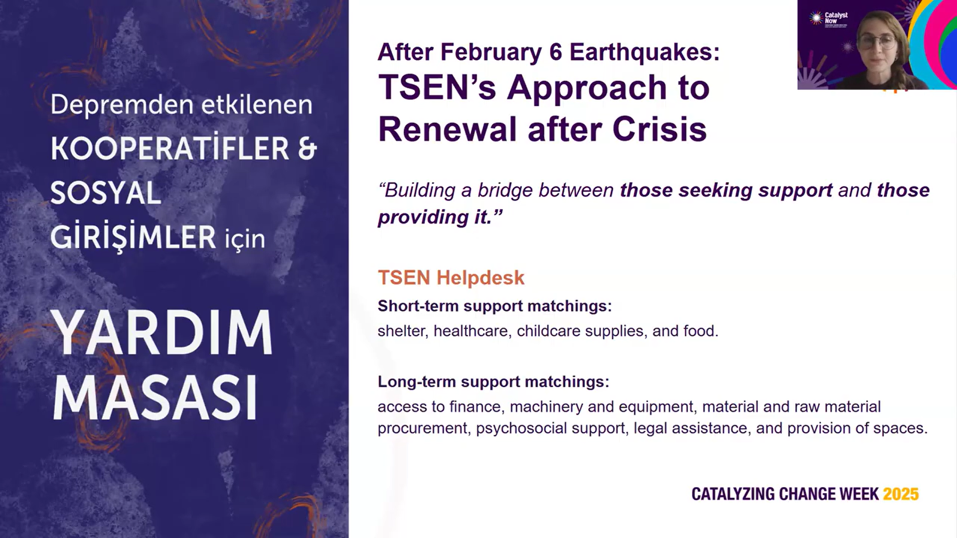 The session began with Elif Muratoğlu from İstasyonTEDU sharing how social enterprise support organizations across the country mobilized through the Turkey Social Entrepreneurship Network (TSEN). In this particular moment of crisis, rather than acting impulsively, the network paused to reflect on how they could create meaningful impact for the affected communities in the region. As Muratoğlu explained, “TSEN’s greatest asset was its extensive connections with social-good oriented actors across sectors and regions, its culture of solidarity and collaboration, and its ability to build bridges.”